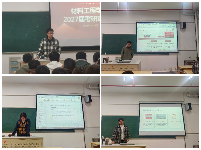 会上,2026年考研录取的4名优秀学生结合自身实战备考经历,多角度分享备考经验。22材控1孟建熙梳理科学择校逻辑与全年复习各科节奏,帮助同学们规避择校与复习误区。22材控1陈宇彤聚焦数学高分备考,拆解高等数学、线性代数核心考点,强调“真题为核、刷题为王”的复习理念。22材控1程俊清细化数学二、英语、专业课备考细节,分享时间规划、答题技巧与心态调节方法。22金属2王瑞琦整合公共课与专业课高分攻略,为同学们搭建完整备考体系,为在场学子提供了可落地、可借鉴的备考思路。